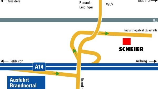 Nehmen Sie die Ausfahrt Bludenz Nüziders (Exit 57). Beim Kreisverkehr direkt nach der Abfahrt Nüziders die zweite Ausfahrt aus dem Kreisverkehr Richtung Bludenz. Folgen Sie dem Strassenverlauf ca. einen Kilometer folgen. Direkt nach dem Renault Autohaus nach Rechts in Richtung Brandnertal abbiegen. Nachdem Sie den Fluss überquert haben gleich Rechts in das Gewerbegebiet Quadrella einbiegen. Das erste Gebäude in grau mit angeschlossener Halle auf der rechten Seite ist der Firmensitz der Scheier Unternehmensgruppe.