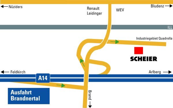Um zu uns zu gelangen nehmen Sie die Ausfahrt Brandnertal (Exit 58). Danach gleich nach Links Richtung Nüziders / Bludenz abbiegen. Direkt nach der Autobahnunterführung links in das Gewerbegebiet Quadrella abbiegen. Das erste Gebäude auf der rechten Seite ist die Firmenzentrale von Scheier.